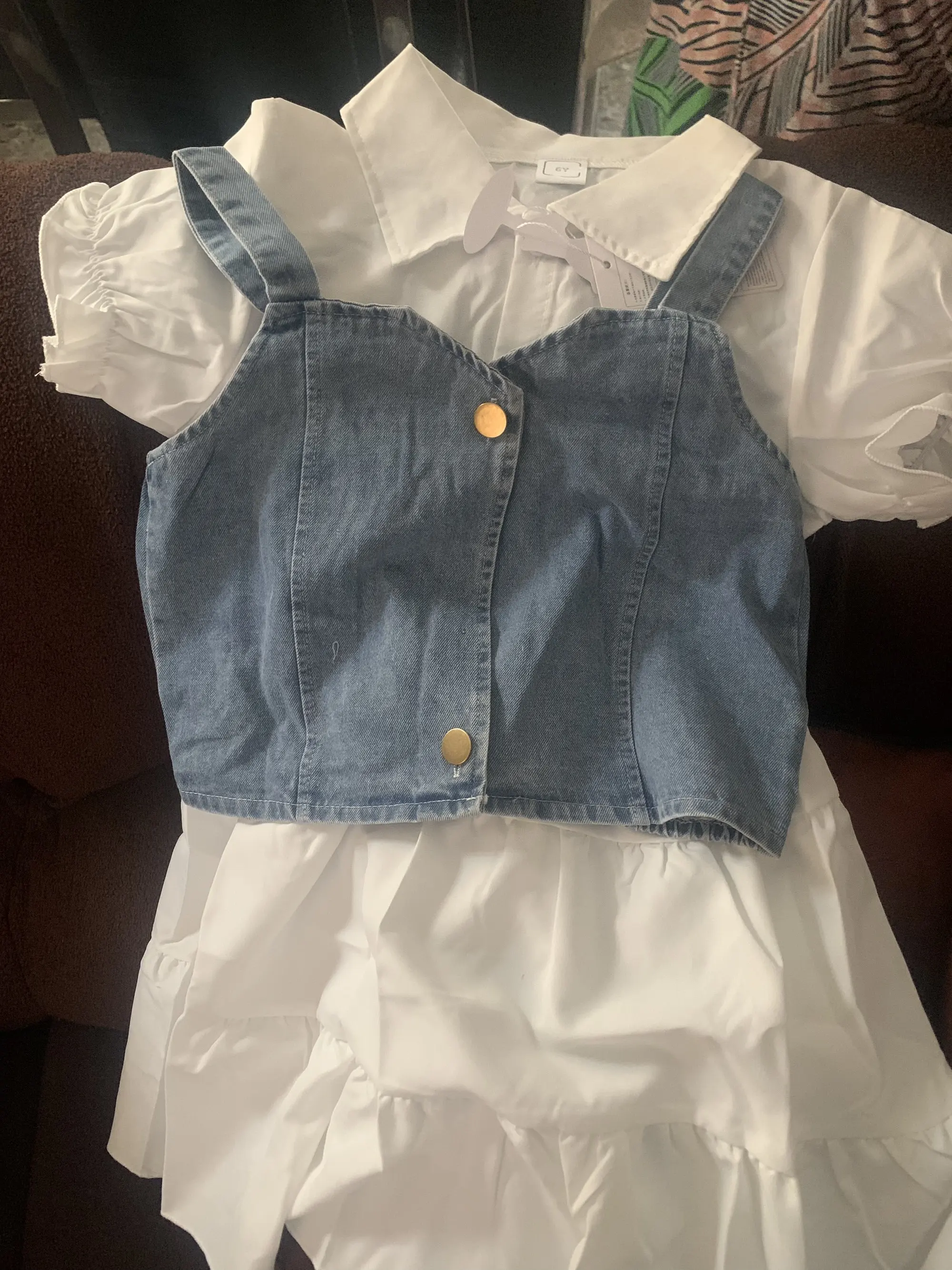 Nieuwe meisjesrok met lange mouwen en jeans geplooide korte rok